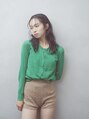 ワンレングスで毛先を切りそろえたミディアム。前髪は目にかかるくらいに長めに残し、薄めにして抜け感を出しました。