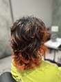 毛先をブリーチでリフトアップ♪ビビットなオレンジカラーをのせて、個性たっぷりなオシャレヘアに♪♪♪パーマをかけたウルフスタイルもポイント★[アッシュブラック/ニュアンスパーマ]