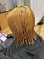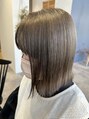 全体をブリーチ後、ミルクティーカラーに少しオリーブをプラスしました。エドルカラーで色持ちよく透明感あるケアカラーは太くて丈夫な髪を柔らかく見せます。