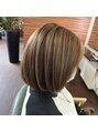 ブリーチでハイライトを入れた後透明感たっぷりのグレーでオンカラー。内巻きでも外ハネでも可愛いボブスタイル。