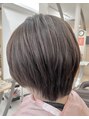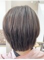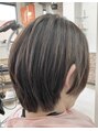 マッシュベースのショートレイヤースタイル。サイドのインナーをツーブロックでスッキリと。縮毛矯正ストレートで全体のボリュームがおさまり手触り良く。サイエンスアクアを重ね、ツヤのある柔らかい仕上がりに。