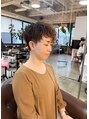 サイドとバックを刈り上げてスッキリ感を出したツーブロックのショート。トップから前髪に強めのパーマをかけました。アレンジやスタイリングで色々な雰囲気を楽しめるパーマデザインです。梅雨時期や暑い時期にも簡単に決まるのでおすすめのデザインです