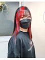デザインブリーチ1回~。脱色した部分にはカラーバターのレッドをオンカラー。全体はブラックでコントラストを効かせたデザインカラー。
