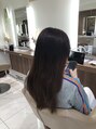 実は中間から毛先がブリーチ毛のお客様。(イヤリングカラーもしていてその部分はブリーチ2回)湿気で髪が広がり頭が大きく見えてしまうので、髪が下ろせずにずっと結んでいるそうです。髪が下ろせるようにブリーチ縮毛矯正をかけていきます。