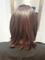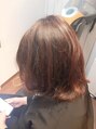 ミディアムベースの長さに、やや前上がりレイヤーグラデーションにカットして、カラーはショコラアッシュ系カラーにブレンド調合で色を入れて、超音波トリートメントもして色持ちと、スタイルの持続性を上げています。
