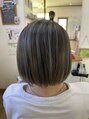 ワンレンボブにバレイヤージュ+ハイライトを施しブルーシルバーをオンしました。前髪にもパネルハイライトで、全体的にブルーシルバーで動きを出しました。
