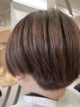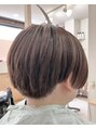 前下がりのショートレイヤー。サイド・ツーブロック、バック・低めソフト刈り上げ。しっかり毛量調整でドライヤーも時短に。10トーン・カーキベージュで赤みを抑えて透明感を。