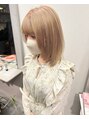 ハイトーンのベージュカラー。顔回り~ネープにかけてしっかりとハイレイヤーをいれたミディアムスタイル。