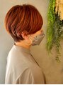 襟足はスッキリ、耳にかかるギリギリの長さのショートスタイル。前髪も長めに残して大人っぽく落ち着いた雰囲気で。カラーはブリーチメッシュにオレンジを入れて立体的に。
