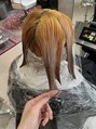 インナーの画像は初回来店時の状態です。履歴はセルフ黒染め、インナーブリーチ3回、縮毛矯正2ヶ月に1回、セルフでインナーにピンクをのせた状態です。毛先の暗いところがダメージレベルと残留色素が凄い状態です。通っていただいて質感よく明るく◎