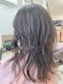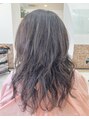 セミロングのウルフレイヤー。デジタルパーマでラフウェーブに。前髪やトップレイヤーのみストレートに。7トーン・フォギーラテで赤みを抑えたくすみカラーに。