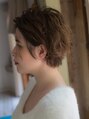 首元スッキリショートスタイル。長めのバングは2対8くらいにかきあげるようにわけて両方耳にかけることで肌を出してヘルシーな印象に。全部かけるのではなく、こめかみあたりからほそーく束を引き出してあげると抜け感のありおしゃれヘアーに。