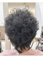 ショートレイヤーのウェーブスタイル。ツイストスパイラルでランダムな無造作感を。毛先を抜いて巻くことで束感の動きに。オーガニック成分配合の5トーン・アッシュブラックカラーで深みを出し、パーマの質感が綺麗に。