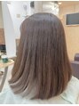 鎖骨ミディアムの内巻きストレート。顎下ラインにおさまるようレイヤーを。オーガニック成分配合の9トーン・フォギーラテカラーに酵素成分配合・アメージングトリートメントを加え、ツヤのある柔らかい仕上がりに。