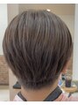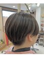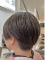 前下がりのマッシュショートレイヤー。サイド・ツーブロック、バック・ソフト刈り上げでスッキリと。7トーン・フォギーアッシュで赤みを抑えたくすみベージュ系カラーに。アメージングトリートメントを加え、ツヤのあるなめらかな仕上がりに。