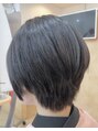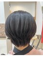前下がりのマッシュショート。縮毛矯正ストレートで広がりやうねりを整え、サラサラな質感に。トリートメント効果のある酸性カラー・ダークブラウンで落ち着いた仕上がりに。