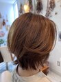 少しひろがる癖毛をいかしたウルフショート、白髪をカバーできるハイトーンで重さをなくします。後頭部からのラインに自然な影ができたように魅せるカットはレザーカットもしています。とにかくキュートな大人女子をイメージしました。