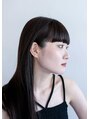 ワイドバングの黒髪ストレートヘア直線的なラインの中に、目尻から前髪の端にかけては緩やかなカーブでラウンド。骨格に合わせてミリ単位で切らせていただきます。