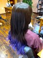 全体を暗くしてブリーチをした毛先に青紫のカラーをしています!髪を巻いたときや結んだ時で雰囲気が変わるのでアレンジを楽しめるカラーになっております!毛先のみビビットなので、派手なスタイルが苦手な方にもオススメ!
