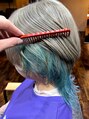 マッシュウルフのグレージュカラーにえりのインナーでエメラルドブルーのカラーをいれてます!個性を出したい方にオススメです!可愛さとインパクトの両方を兼ね備えてます!!