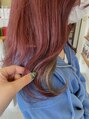 全体ブリーチ後上を深めの赤ピンクに、インナーをミルクティーベージュに染めたデザインカラーです♪前髪にもインナーでベージュを入れてます!