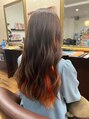 インナーカラー【オレンジ】1ブリーチ後、ハッキリとしたオレンジを作って塗布しました!幅はかなり広めに見えますが、インナーなので表面の髪をおろすと、かなり隠れるスタイルです!表面の髪色はミルクティブラウンです☆