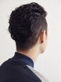 アシンメトリーにかき流した無造作なウェーブヘアが印象的なツーブロックスタイル。アップバングですっきりしているのでトラッドスタイル、好印象ビジネスシーンにも◎グリースやムースを揉みこむだけの1分スタイルでスタイリング可能!