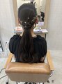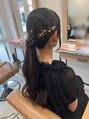 毛先に少しカールが残る程度のゆる巻ベースでタイトめのローポニースタイル☆結び目は三つ編み、全体的に金箔をつけてより可愛くより華やかに^ ^