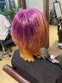 ダブルカラーで作る個性的なスタイルです。発色のいいカラーを使っていて、より鮮やかなデザインに。色の出方などブリーチの回数によって異なりますので、ご相談してください!