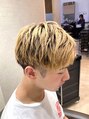 刈り上げとアップバングスタイルに根元を空けてブリーチをすることで立体感を出します!ドライヤーで前髪を立ち上げても下ろしても決まりやすいスタイルです!全体に肩過ぎないワックスを馴染ませて束感を出します!