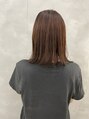 くせ毛で広がりやすい髪の毛も酸性ストレートパーマで柔らかいナチュラルストレートに。毛先には少し残る程度でクセを生かしてます。後ろは短めの前下がりミディアムヘア。