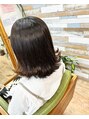 カット、ダメージレス縮毛矯正。切りっぱなし外ハネボブ。クセは強めだけど、髪は細くて傷みやすい髪質、PH高めの酸性縮毛矯正で柔らかツヤツヤに。伸びてきた根本だけ縮毛矯正して、外ハネにスタイリング。