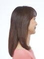 白髪が伸びてきても目立ちにくい明るめベージュブラウンで、肌のトーンもアップします。前髪を作り分け目が出ないようにすることでトップに高さがでます!