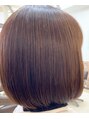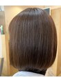 顎下ラインのショートボブ。襟足の生えぐせを抑え、インナーにグラデーションを入れ、スッキリおさまるボブに。9トーン・カシスブラウンのワンカラーで淡い赤みの落ち着いた仕上がりに。