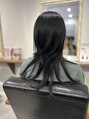 かわいい姫カット+ロングレイヤーウルフ個性的な姫カットとウルフは相性が良いです。最近多いウルフとは少し違いますが、応用が多いスタイルです。カラーは黒です。