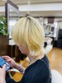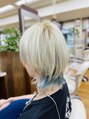 ブリーチリタッチに、オンカラーで白っぽい金髪と、インナーカラーでパステルちっくの水色。水色にする際は、カラー剤の取り寄せの関係で、事前に言っていただけると助かります。