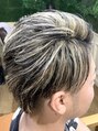 メッシュキャップという全頭にメッシュ(ハイライト)を入れることが出来るシリコンの帽子を使ったカラーリングです。追いブリーチで3回ブリーチしてシナモンベージュに補色でバイオレットを少々入れてイエローを抑えてます。退色経過で良い感じになります。