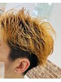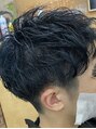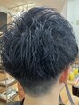 マッシュショートレイヤーのゆるめパーマ。全体の毛先のみ動きが出るようにランダムパーマ。刈り上げ以外のトップをブリーチ1回+6トーンのネイビーブルーブラックで透け感のある落ち着いた仕上がりに。