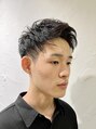ツーブロックからの刈り上げアップバングスタイル。襟足は少しえぐり気味で刈り上げました。