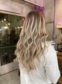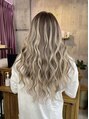 全体ブリーチをしてミルクティーベージュにカラーしてからハイライトを太めに混ぜながらシールエクステ80枚付けてロングスタイルにしました。地毛の長さは胸ぐらいです。