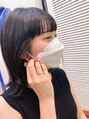 オトナモードなミディアムヘア。ワイドでブラントな前髪と、耳にかけてもかわいい顔まわりが特徴のデザインです。