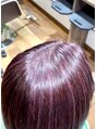 細かめにハイライトをたっぷり入れてバイオレット系をオンカラー。トーンアップや白髪ぼかしにオススメです。カラーの前に髪の付着物を除去して、妨げになるのがない状態からハイライト、オンカラー。仕上げにリンゴ幹細胞トリートメントで艶ふわに。