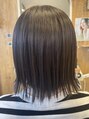 ロングヘアからのバッサリスタイルチェンジ。若干前下がり気味のきりっぱなしボブ。ボリュームをおさえるため縮毛矯正をしました。重くなりすぎず毛先は簡単に動きが出せるようにカット、毛先まで多めに減らしました。