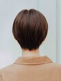 前髪をセンター分けに立ち上げているので大人っぽいスタイルに。髪色をダークトーンのブラウンにしているのでトップに動きが出るようにブローしています。前髪を外に流れるように流しているのでクールっぽさもありつつ大人っぽい印象に。