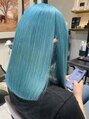 あんさんぶるスターズ!!のHiMERUくんをイメージした推しカラーです!全体をブリーチ後、カラー剤でホワイト系の下地を作った後にカラーバターで彩度低めの水色の色を入れているデザインです♪