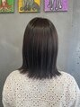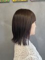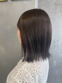 カットは、ミィディアムの切りっぱなしボブです。外ハネにスタイリングしやすいように毛量調整をしてあります。カラーは、サイド内側からバックにかけてブリーチで毛先を抜いてからバイオレットを入れました。トップはアッシュの6トーンです。