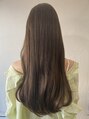 毛先をパツンとカットしたロングヘア。スリークに見えるようしっかり間引き。顔まわりは顎ラインで設定。動きが出やすいようにレイヤーを入れる。カラーは全体に細めのハイライトを入れ、明るめのオリーブベージュを重ねて重めスタイルでも軽やかな印象に。