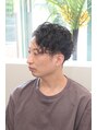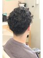 マッシュベースのカーリーヘアー、全体的に丸いフォルムで、重すぎず、軽さを出して仕上げました。周りはしっかり刈り上げて爽やかに。トップは遊びのある長さを残してパーマをかけました。