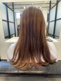 Iラインのロングヘア。顔周りは、長めに残した前髪をな流れるようにカット。(お顔も一層小さく見せる事が出来ます◎)カラーは、くすみすぎないよつに、シアベージュ。