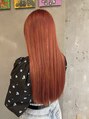 全体をブリーチしてから、ベリーピンクの8トーンを乗せました。鮮やかなパキッとピンクがスーパーロングの髪に映えます。カットは重めぱっつんでより存在感を出してあります。